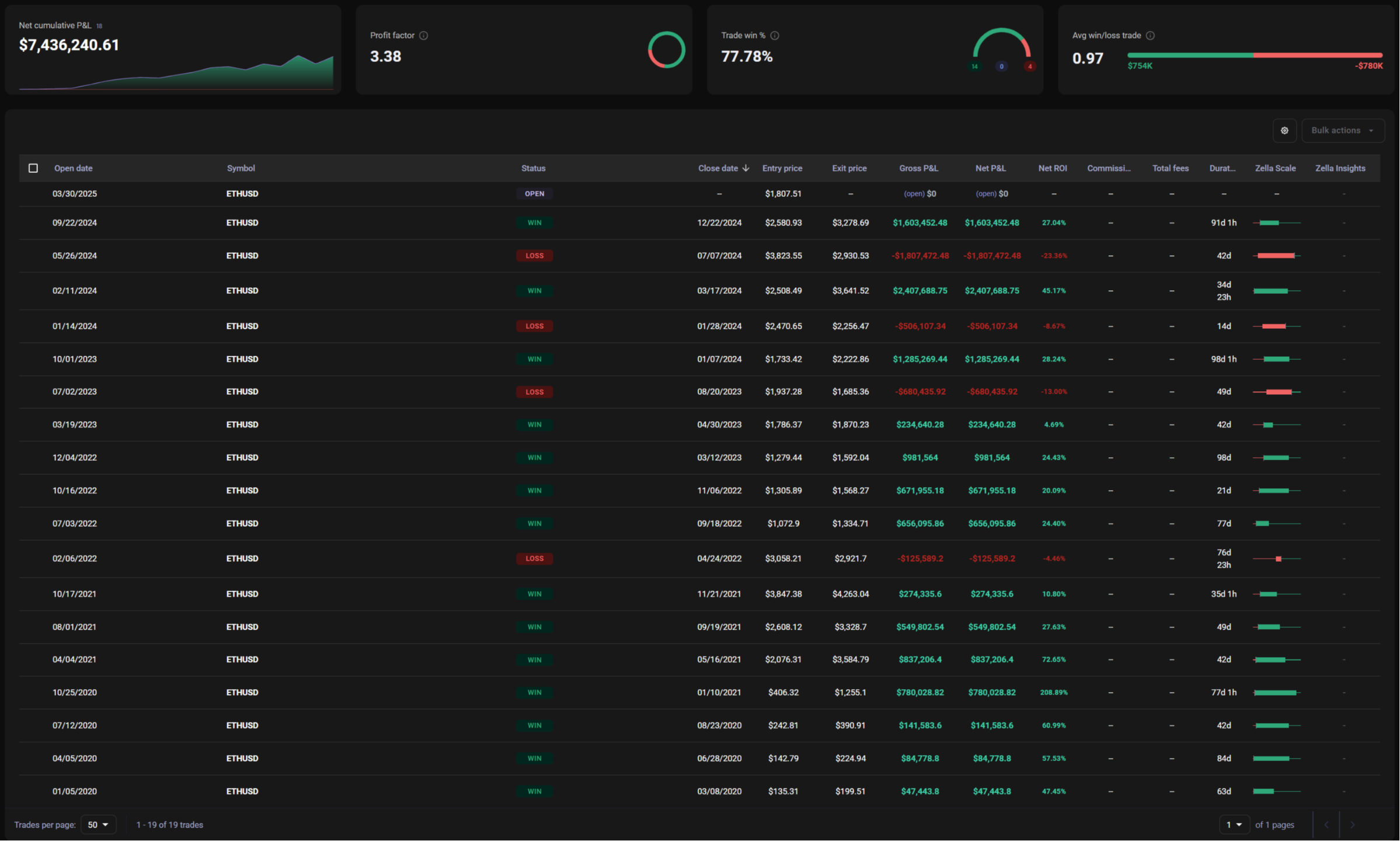 *Starting capital for each ticker symbol is $100,000. Example is based on backtested trades. Trades' performance from March 2025 has been confirmed in real time. Example doesn't take into account taxes, fees, and slippage. Read the full disclaimer in the footer menu.